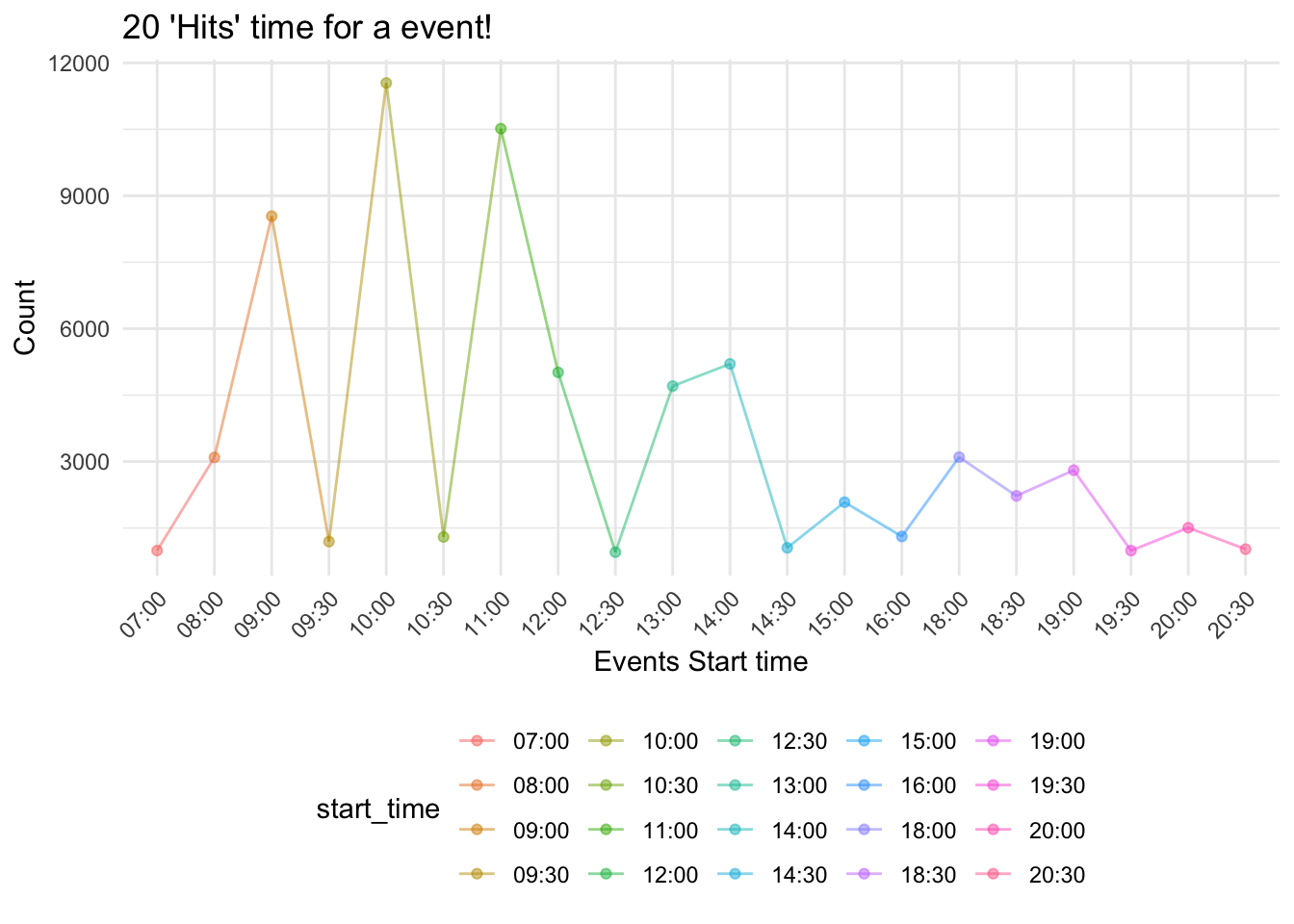 Here’s the plot shows top 20 start time within a day which held the most parks events. Obviously, from 7:00 am to 8:30 pm within a day, the top three start time which held the most parks events were 10:00 am - 11:00 am, 11:00 am - 12:00 am, and 9:00 am to 10:00 am.